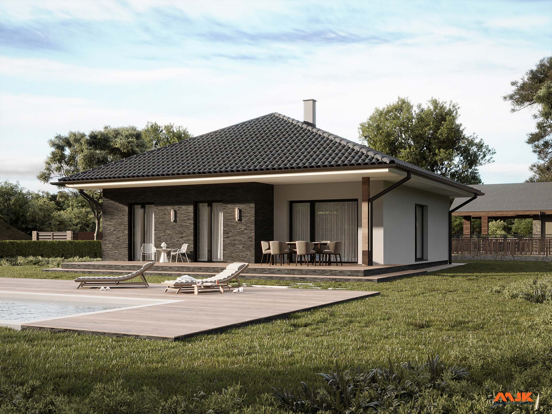 Terasa je prístupná cez portálové dvere v obývacej časti. Pri kuchyni je situovaná komora. V nočnej časti sa nachádzajú 3 izby. Technické zázemie medzi dennou a nočnou časťou tvoria kúpeľňa s WC, samostatné WC, technická miestnosť a garáž pre parkovanie dvoch motorových vozidiel. Technická miestnosť je prístupná z exteriéru a garáže. Dom je riešený ako murovaný so zateplením. Strecha objektu je valbová (väzníkový krov) s predĺžením nad terasu (prípadne bez zastrešenia terasy).
