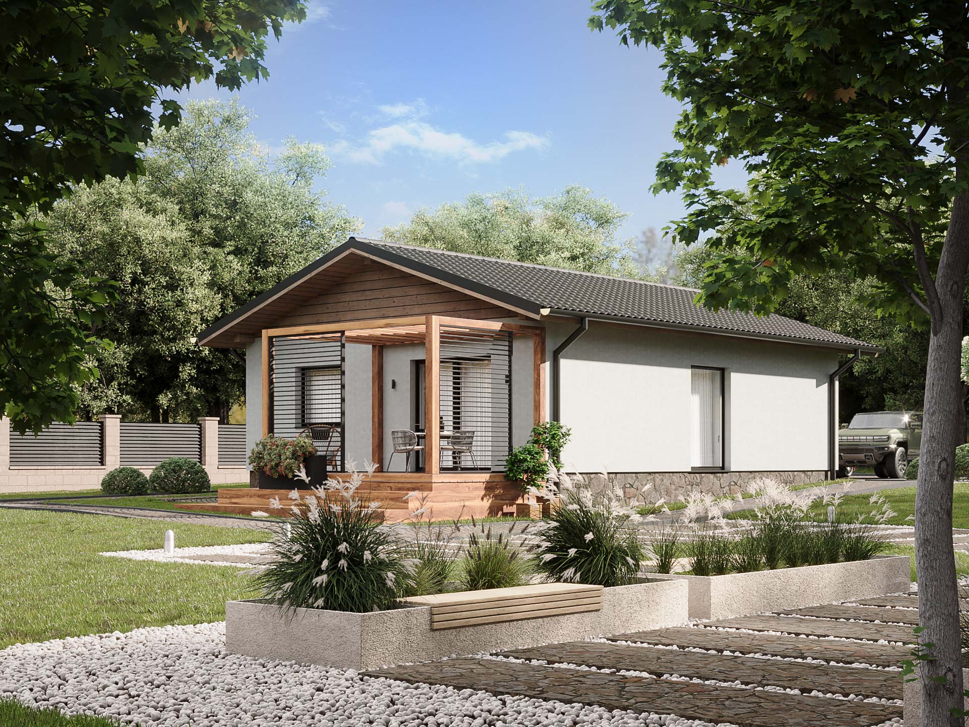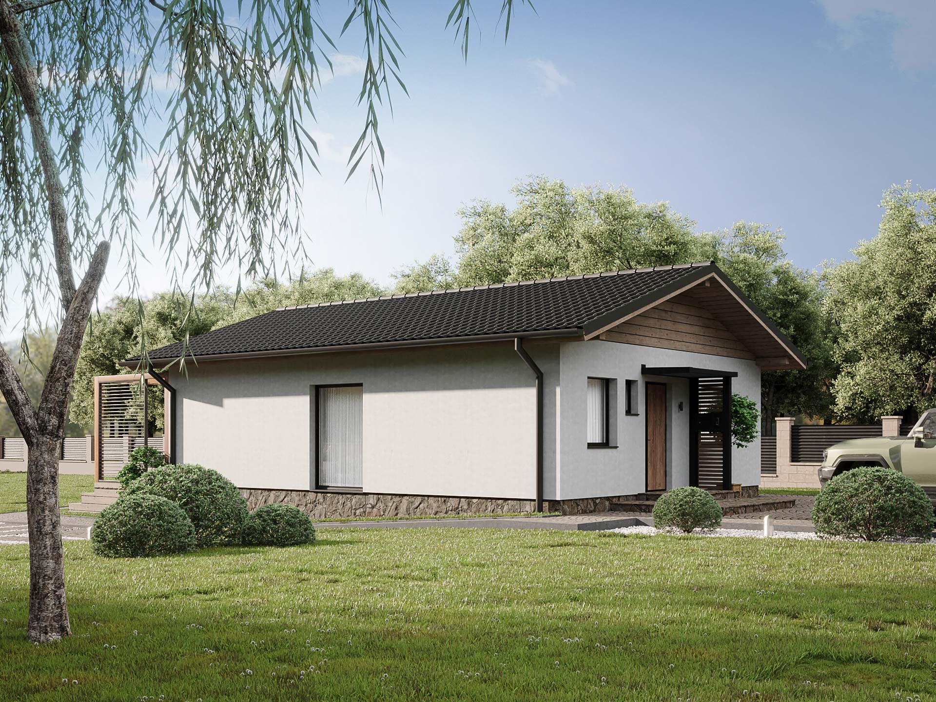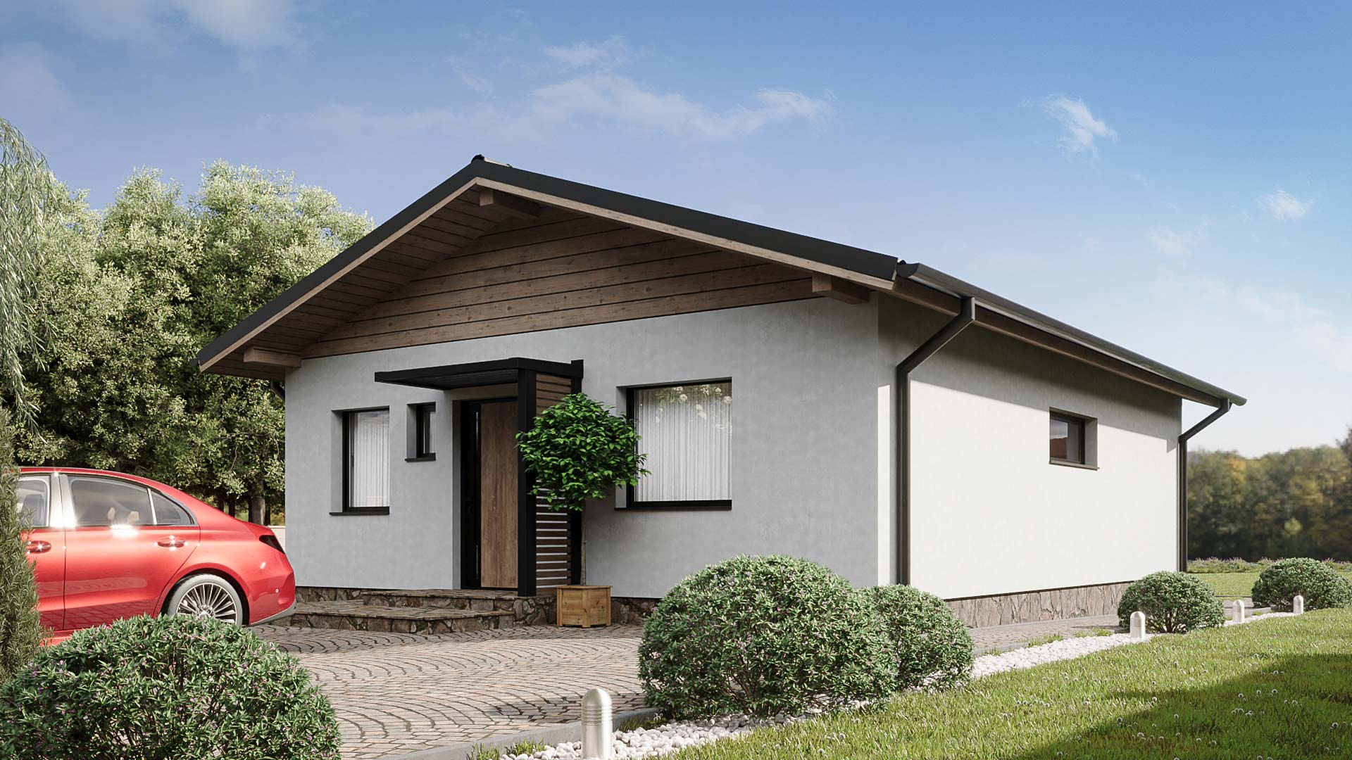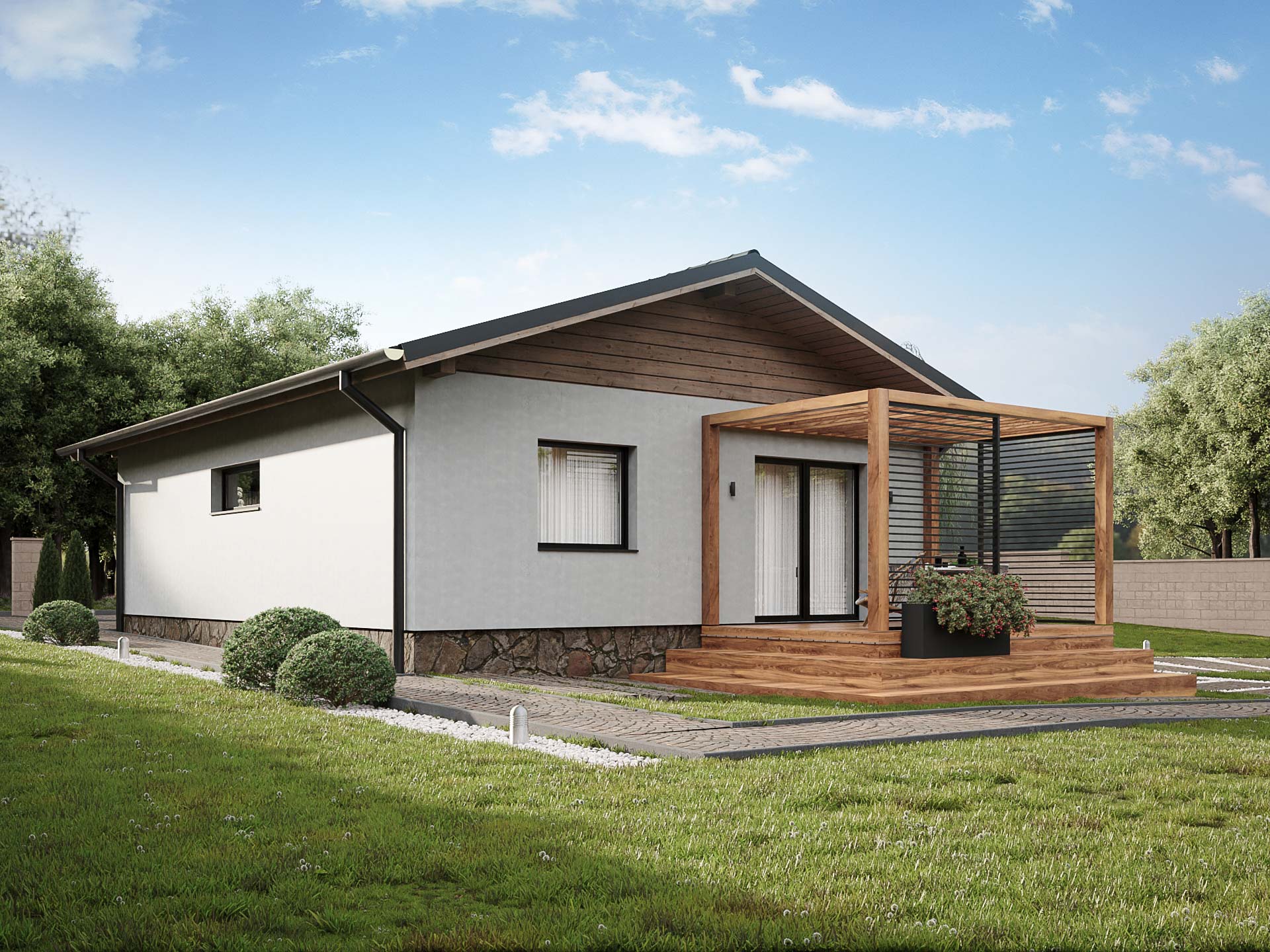 Samostatne stojací prízemný bungalov bez podpivničenia je vhodný do rovinatého terénu. Je to dom väčšej veľkostnej kategórie. Vhodný pre bývanie 4-6 člennej rodiny.