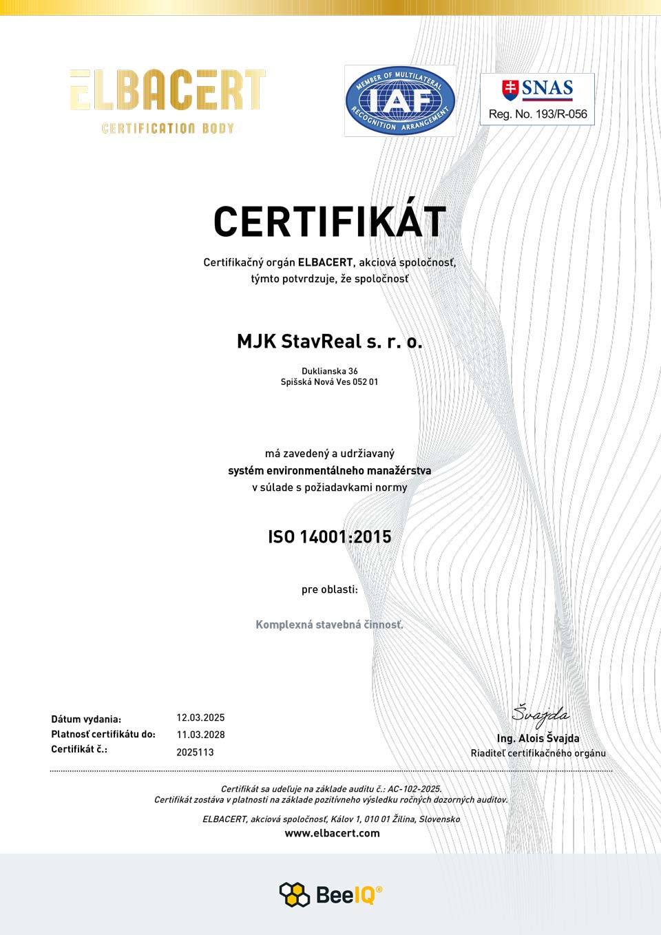 V spoločnosti MJK StavReal s. r. o. kladieme dôraz na kvalitu, spoľahlivosť a zodpovedný prístup k životnému prostrediu. Úspešne sme získali certifikáty ISO 9001 2015 a ISO 14001 2015, ktorými si plne stojíme za dodávaním excelentných služieb v oblasti komplexnej stavebnej činnosti a dodržiavaním princípov environmentálneho manažérstva. Pre nás to nie sú iba dokumenty – sú záväzkom, že sa neustále zlepšujeme.